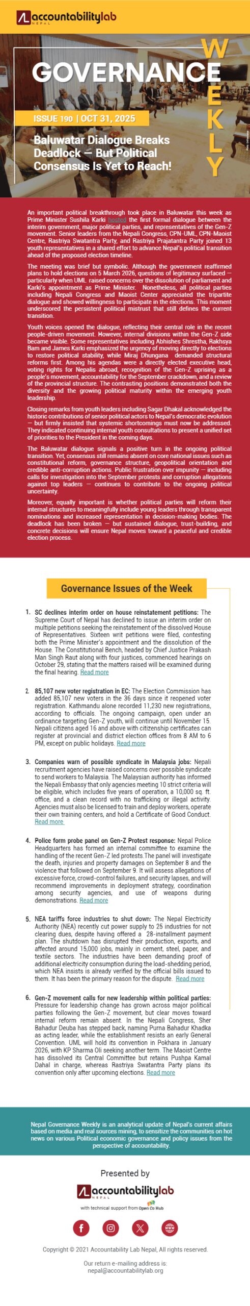 View Larger Image Governance Weekly 190 By Ashok Pariyar|2025-10-31T17:13:59+05:00October 31, 2025|Comments Off on Governance Weekly 190 Share This Story, Choose Your Platform! FacebookXRedditLinkedInWhatsAppTelegramTumblrPinterestVkXingEmail About the Author: Ashok Pariyar