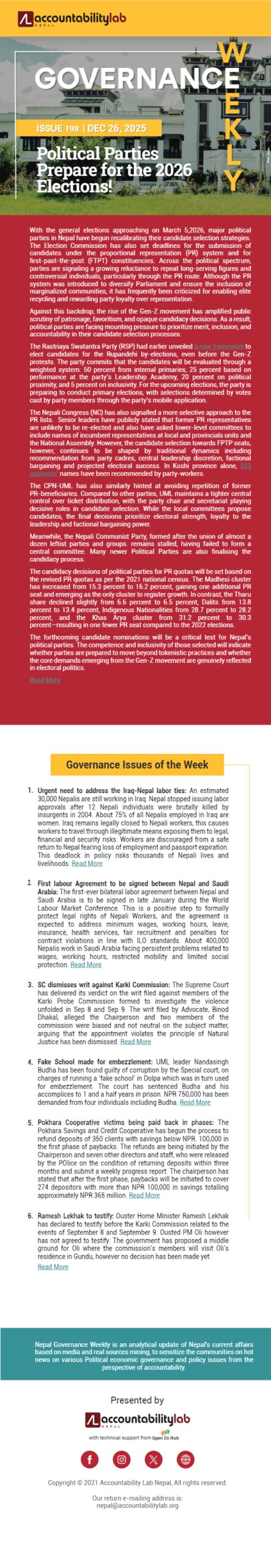 View Larger Image Governance Weekly 198 By Ashok Pariyar|2025-12-26T16:55:50+05:00December 26, 2025|Comments Off on Governance Weekly 198 Share This Story, Choose Your Platform! FacebookXRedditLinkedInWhatsAppTelegramTumblrPinterestVkXingEmail About the Author: Ashok Pariyar