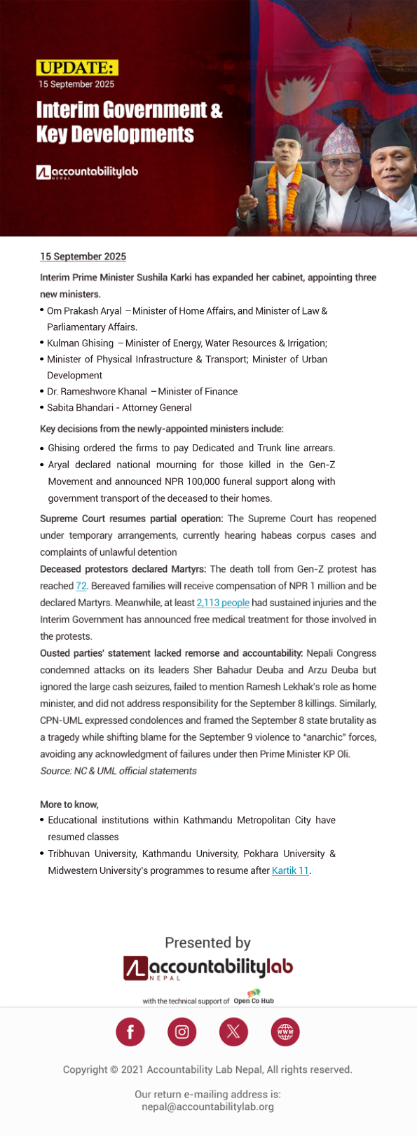 View Larger Image Interim Government & Key Developments (15 September 2025) By Ashok Pariyar|2025-09-15T21:49:53+05:00September 15, 2025|Comments Off on Interim Government & Key Developments (15 September 2025) Share This Story, Choose Your Platform! FacebookXRedditLinkedInWhatsAppTelegramTumblrPinterestVkXingEmail About the Author: Ashok Pariyar